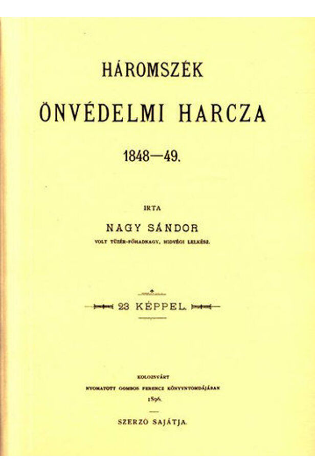 Erdély délkeleti, erdős hegyekkel koszorúzott fennsíkja, Háromszék történetét dolgozza fel a kötet az 1848/49-es szabasdágharc idején. A szerző, Nagy Sánodor helyi születésű révén maga is szemtanúa volt az eseményeknek. A mű első felében a történeti rész kapott helyet, amelyet a második rész okmánytára egészít ki. A történeti részben először egy írást olvashatunk a korabeli eseményekről, amelyet rövid életrajzok, valamint a székely tüzérség számos tanítójának jellemzése követ. irta Nagy Sándor [Kolozsvár] Kolozsvárt : a szerző sajátja, 1896.