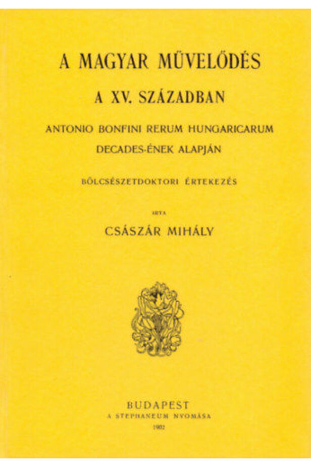 Császár Mihály a 15.századi magyar művelődéstörténetet dolgozza fel a kötetben Antonio Bonfini munkája alapján. A kötetben helyet kapott az iparművészet, az építészet, a szobrászat és a festészet tárgyalása is. Művelődéstörténeti értekezések című sorozat. Budapest, Hornyánszky nyomda. 1902.